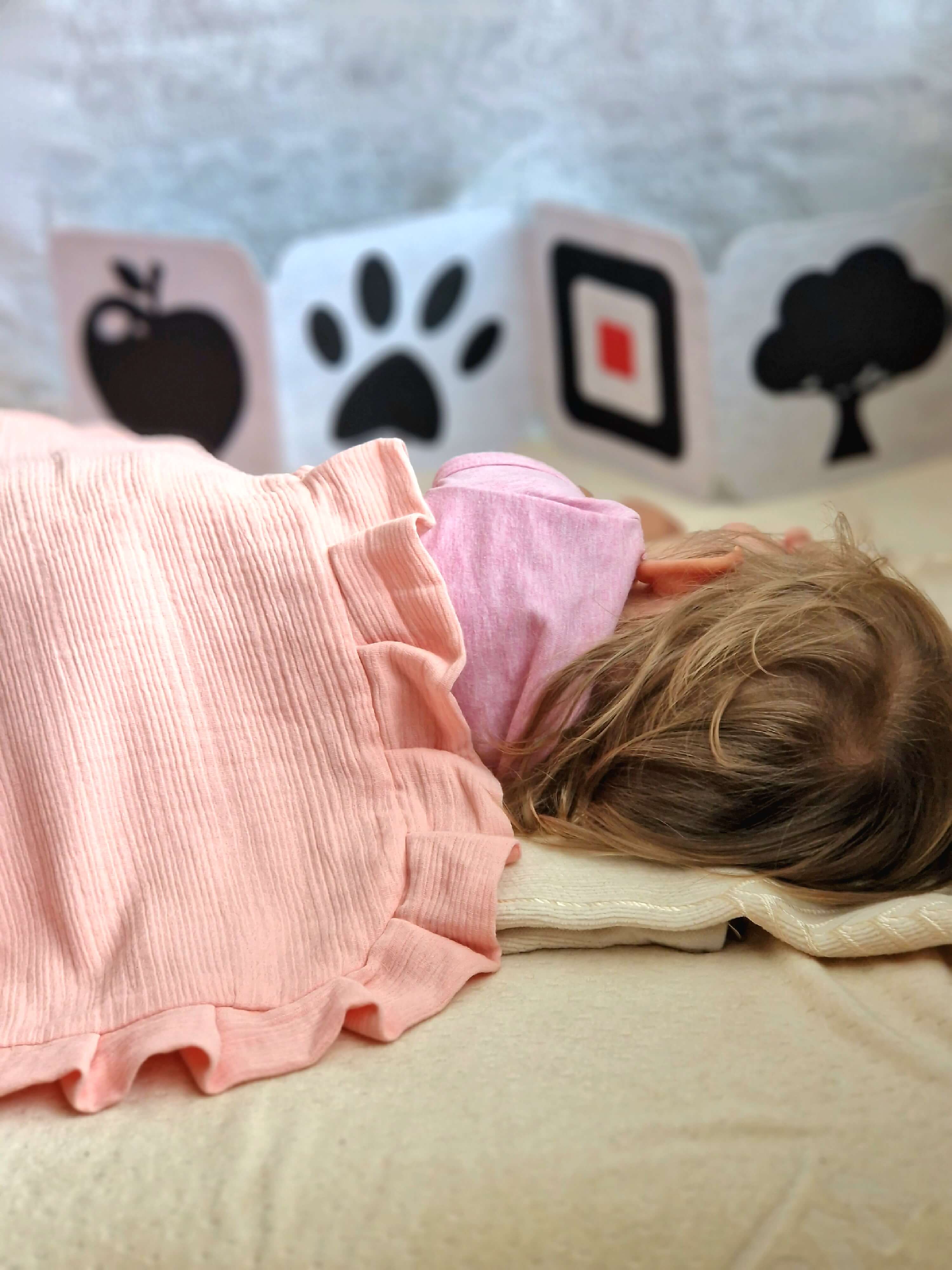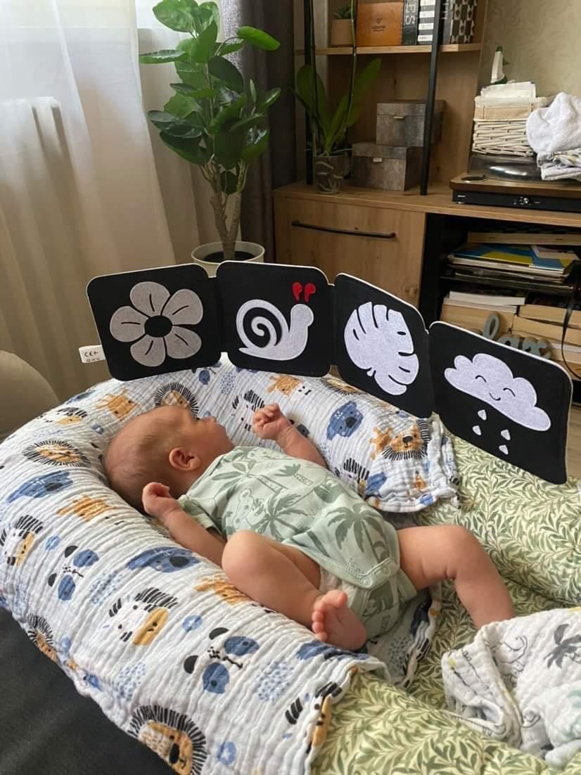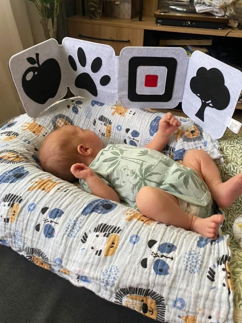 Uz naše kontrastne kartice, svaki trenutak postaje prilika za učenje i istraživanje svijeta oko sebe. Možete ih položiti ispred bebe dok leži na trbuščiću čime ćete je, osim razvoja vida, potaknuti i na aktiviranje vratnih i leđnih mišića prilikom podizanja glave.