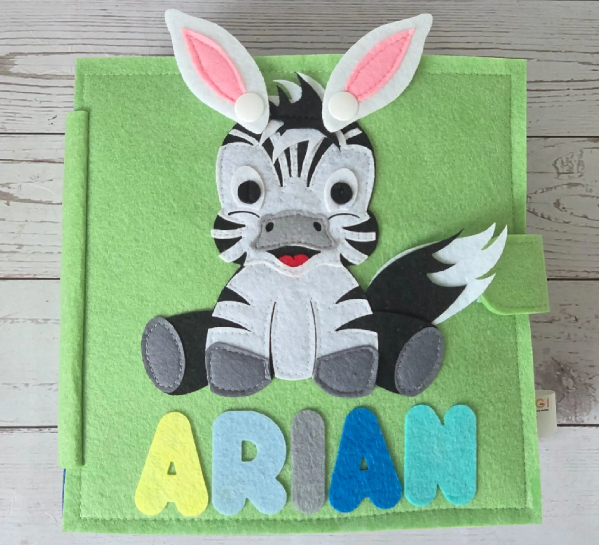 Zebra sa ušima koja se mogu skinuti (plastični drikeri). Ova aktivnost pomaže djetetu u razvoju fine motorike i spretnosti prstiju. Senzorni elementi doprinose boljoj percepciji oblika i tekstura, dok kačenje ušiju vježba koordinaciju i razumijevanje uzročno-posljedičnih odnosa.