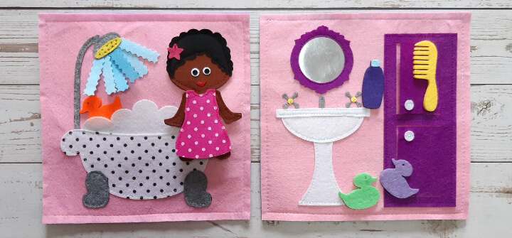 Djevojčica u kupatilu i navike lične higijene. Ormar sa češljem i šamponom, i dvije male patkice – Ova stranica pomaže djeci da razviju svijest o važnosti higijene kroz igru sa djevojčicom i njenim toaletnim potrepštinama. Djeca kroz ovo iskustvo uče kako održavati higijenu, što potiče razvoj svakodnevnih navika.